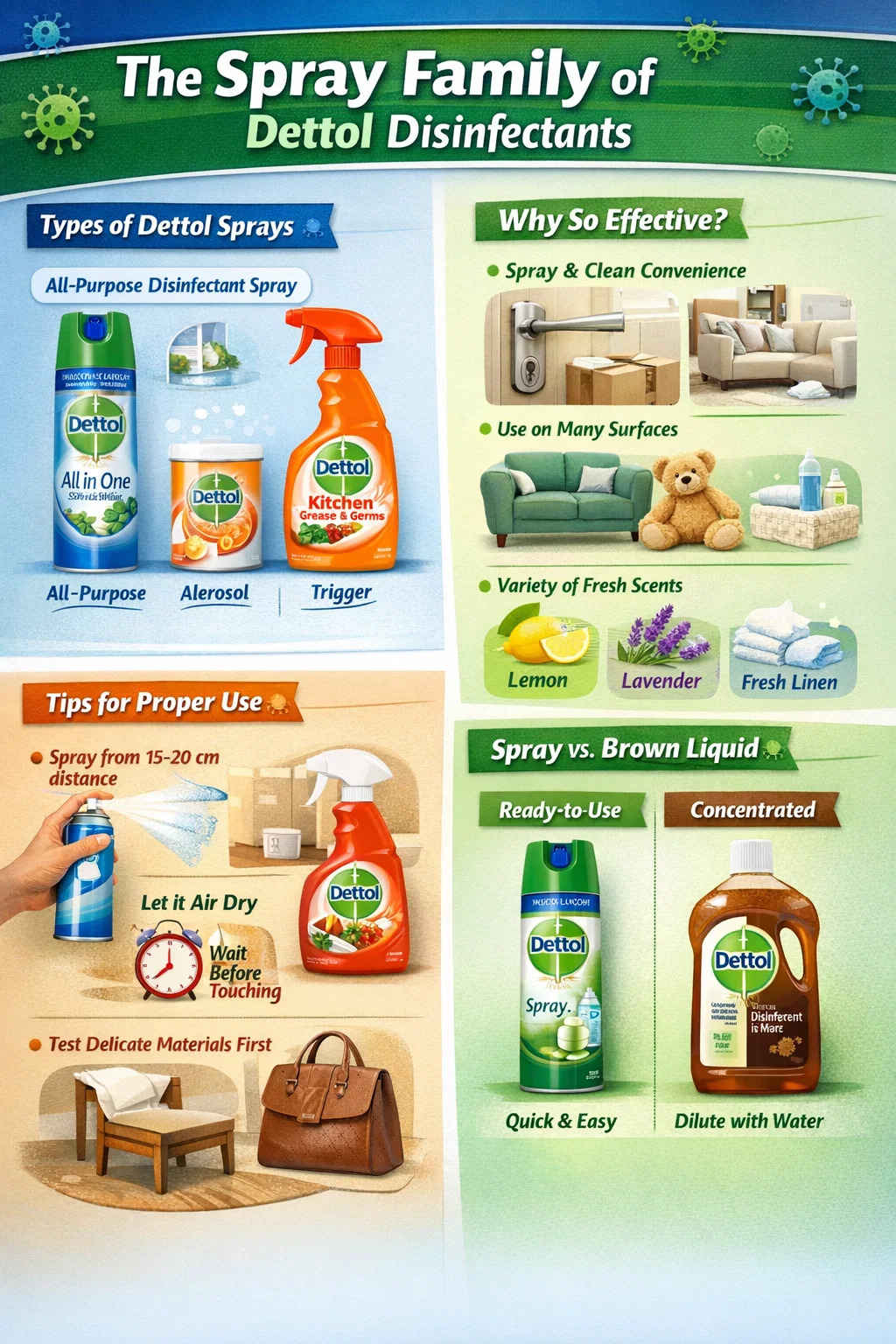 Ниже приводится подробное описание особенностей и частого использования дезинфицирующих спреев Dettol: