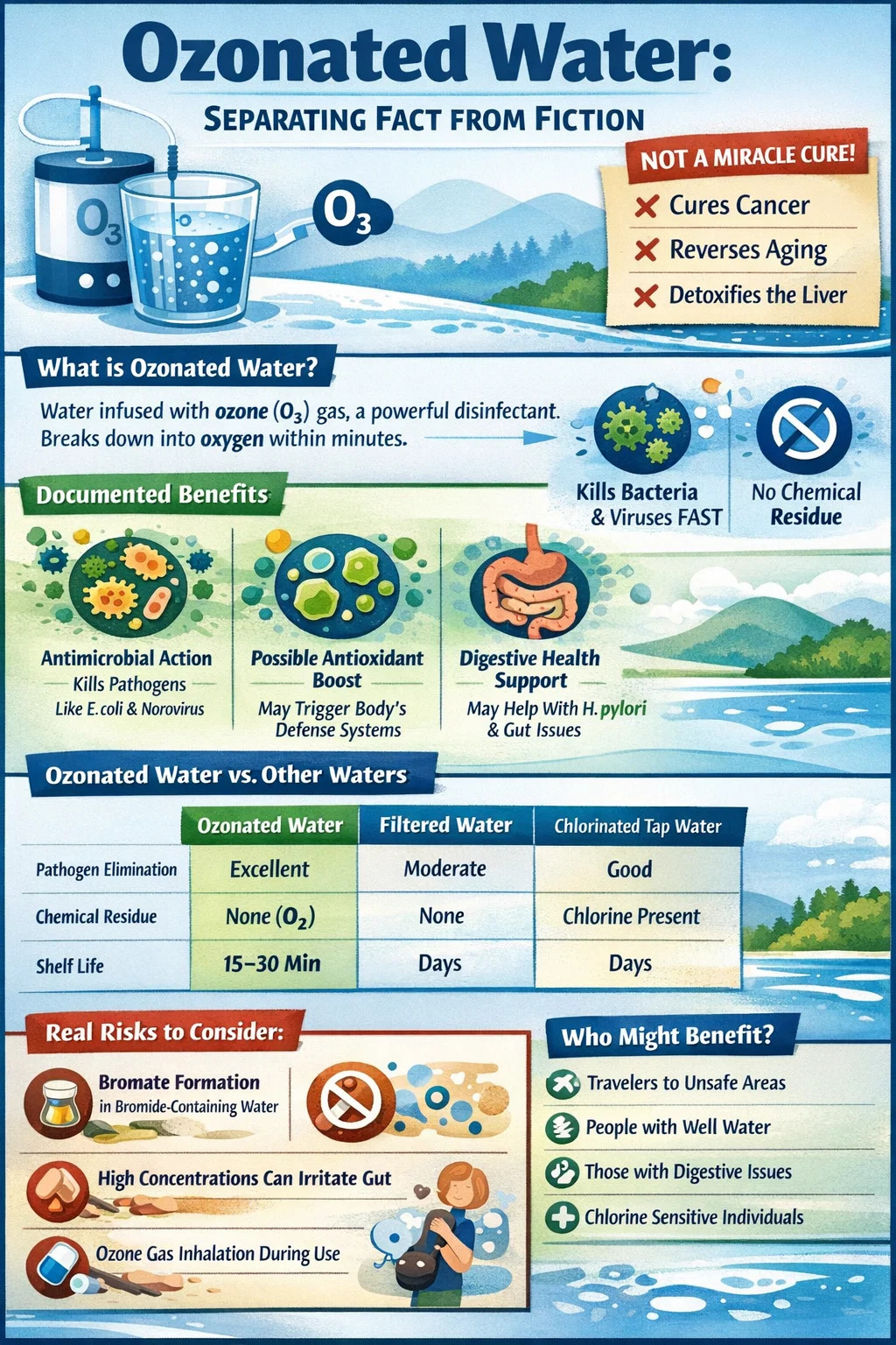 Озонированная вода занимает свое место в качестве законного средства очистки воды с реальными, документально подтвержденными преимуществами — в первую очередь благодаря своей исключительной способности уничтожать болезнетворные микроорганизмы, не оставляя химических остатков. Оно также демонстрирует многообещающие (хотя еще не окончательные) доказательства поддержки антиоксидантной защиты и здоровья полости рта. При использовании в соответствующих концентрациях из качественного устройства и в свежем виде он безопасен для большинства здоровых взрослых.