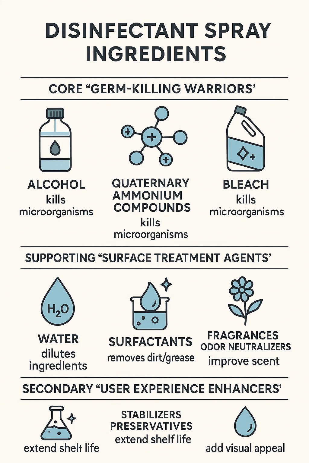 Механизм действия: Проще говоря, это **"жироудаляющие"** ингредиенты. Они уменьшают поверхностное натяжение жидкости, позволяя спрею лучше смачиваться и проникать в мельчайшие щели на поверхности, а также удаляют грязь и жир, позволяя компонентам дезинфицирующего средства напрямую воздействовать на микроорганизмы.
