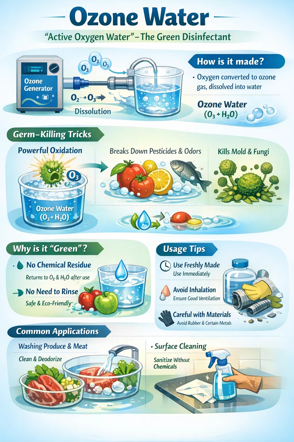 Озоновая вода представляет собой жидкость, образующуюся при растворении газообразного озона в обычной воде, в результате чего получается вещество с мощными очищающими и дезинфицирующими свойствами. Ее часто образно называют «водой с активным кислородом» или «зеленым дезинфицирующим средством».