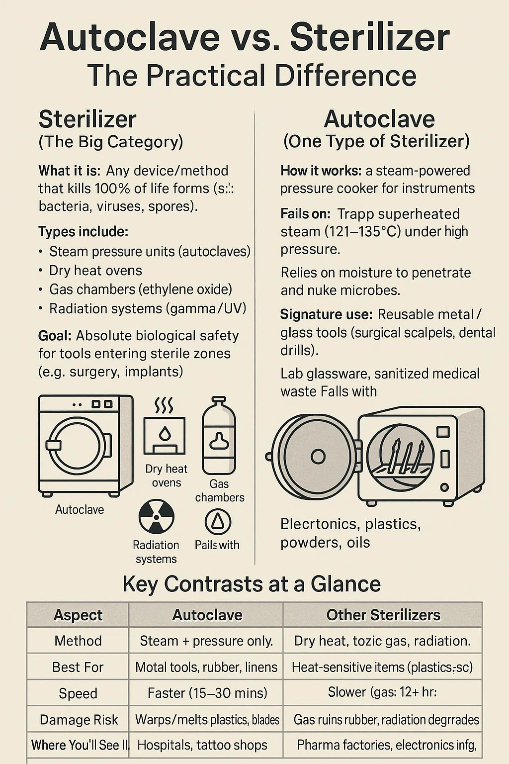 | Где вы это увидите | Больницы, тату-салоны, лаборатории. | Фармацевтические заводы, производство электроники. |